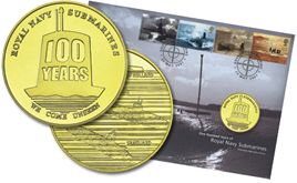 The bold representation of a submarine's conning-tower, emerging from the depths, features as the obverse design, while images of four vessels from the Holland 1, the first Royal Navy submarine, to the contemporary nuclear submarine, the Vanguard, appear on the reverse.